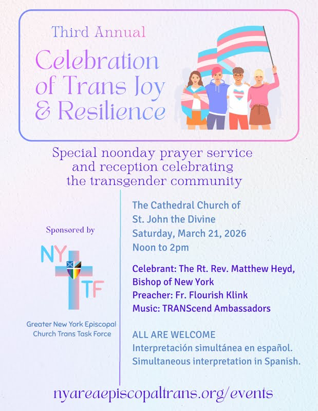 The Cathedral of St. John the Divine and the Episcopal Diocese of New York are committed to supporting and celebrating our transgender siblings in this dangerous time for them in our country. Join us for a special noonday prayer service with the Very Rev. Winnie Varghese featuring music by the TRANScend Ambassadors, a trans/gender-diverse choir. This service will be livestreamed for all to enjoy either in person or online.